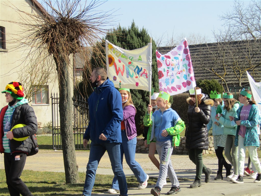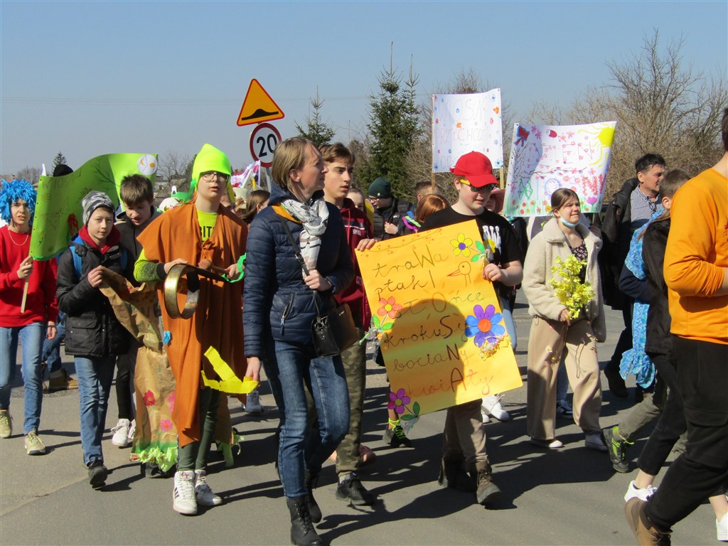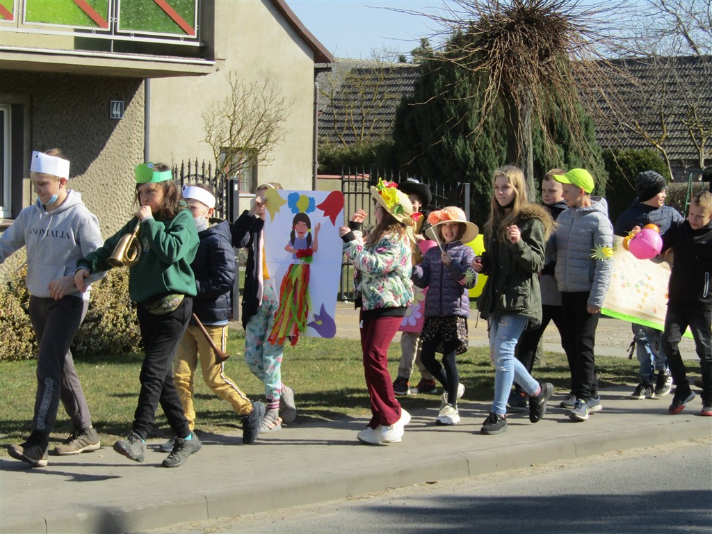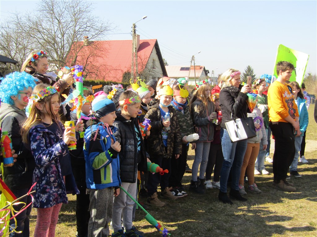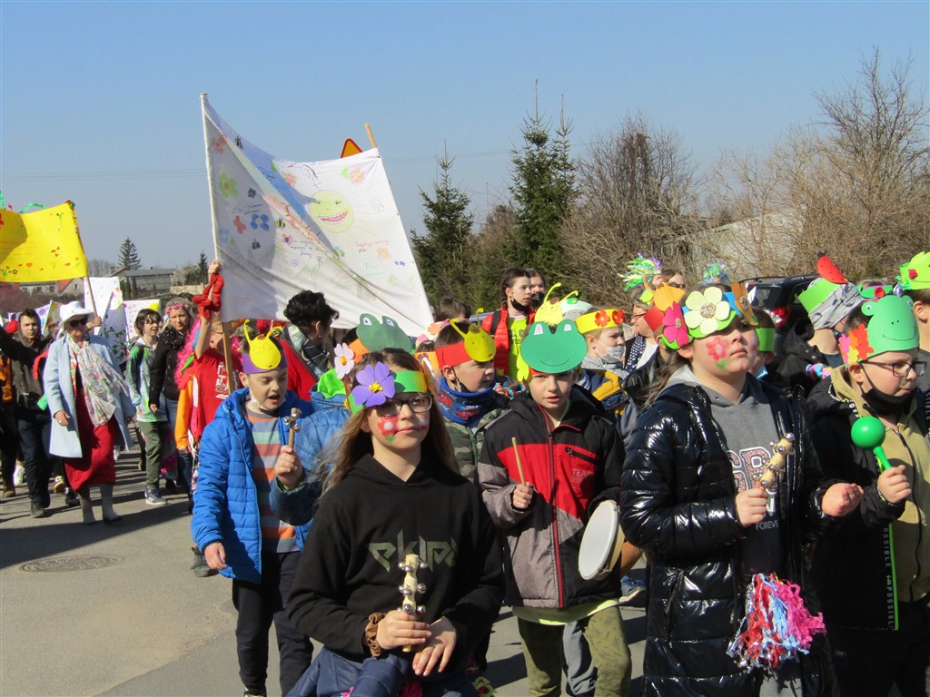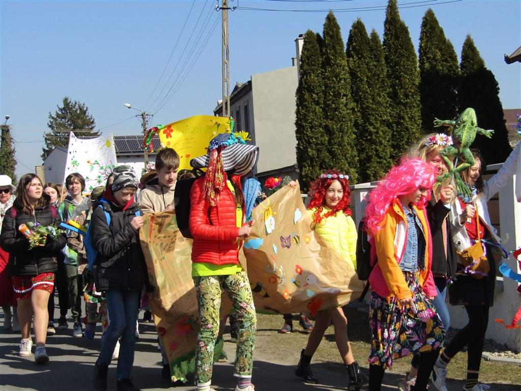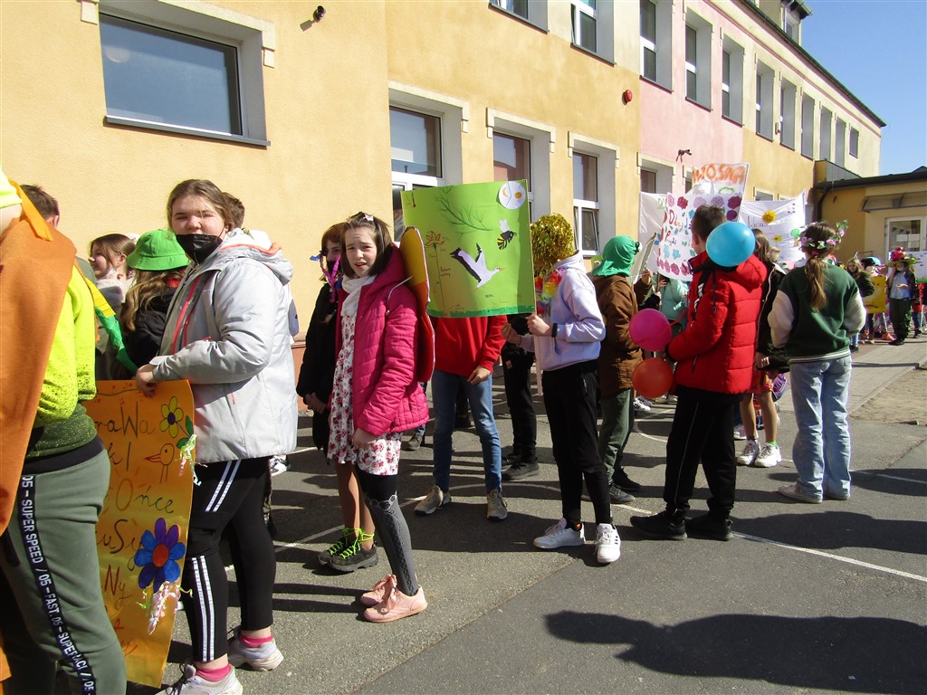 Każda klasa przygotowała stroje, plakaty, transparenty witające wyczekiwaną porę roku. Pogoda nam sprzyjała. Było głośno, wesoło i kolorowo.
