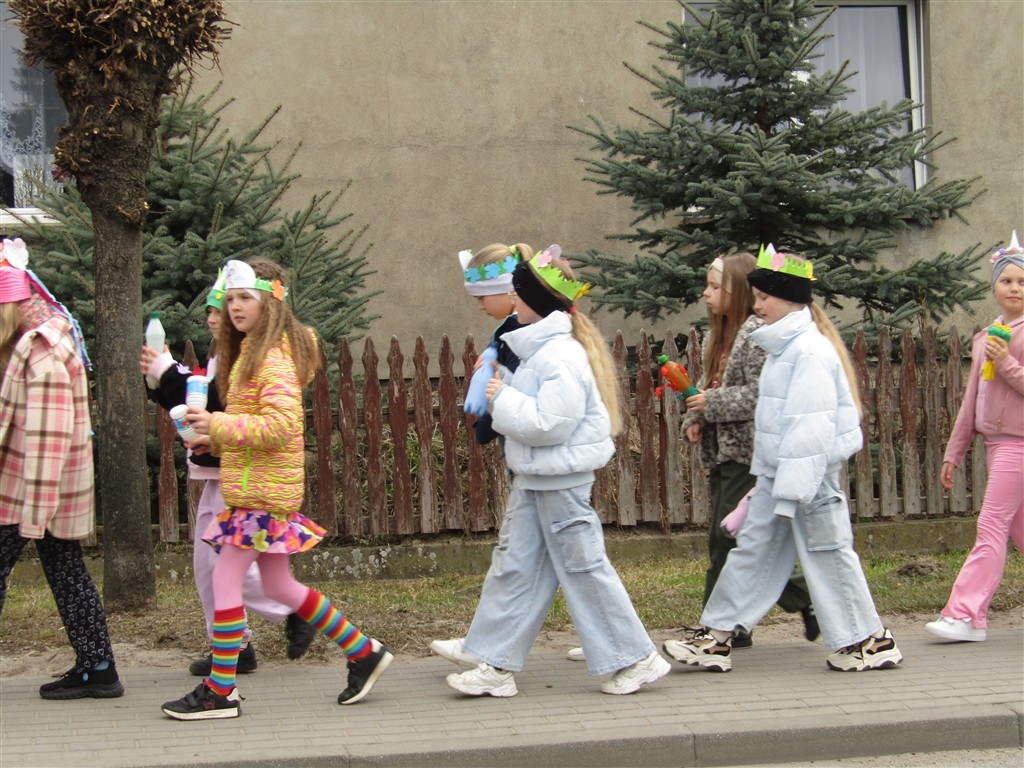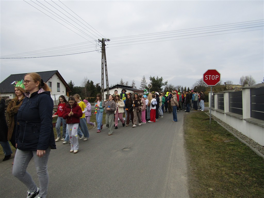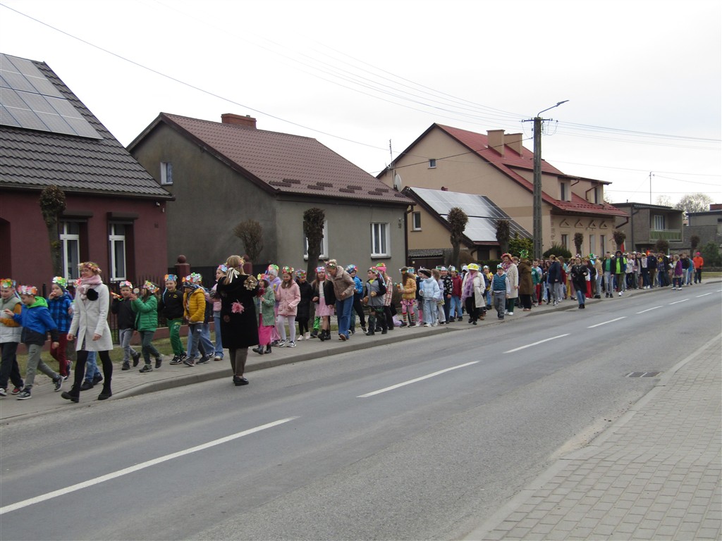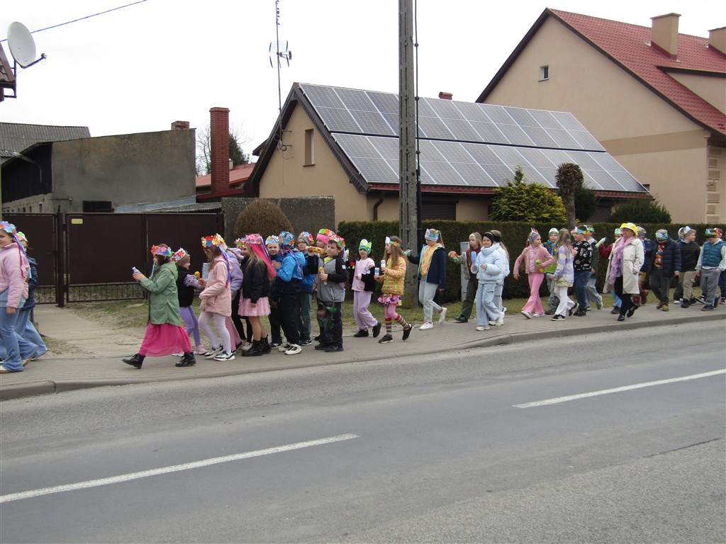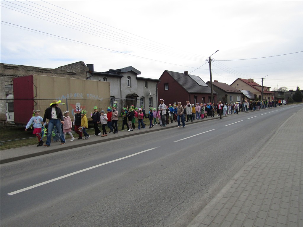 Chyba wszyscy mieszkańcy (i nie tylko) słyszeli, jak serdecznie ją przywitaliśmy. Zarówno przedszkolaki, jak i uczniowie przeszli przez wieś w kolorowych strojach z głośnymi okrzykami i odgłosami.